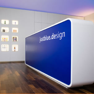 TRESEN + PRÄSENTATIONSWAND Empfang + Konferenzraum für justblue.design, Designagentur